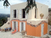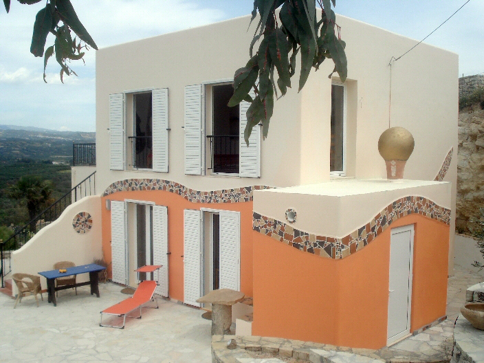 This apartment is suitable for 2 and / or up to 4 people, because it has two equally large bedrooms with 2 beds and a wardrobe and a chest of drawers. One of the bedrooms leads with a double door into the courtyard, the other one ont the terrace, where you can have a wonderful breakfast. A very atmospheric living area with kitchen, sitting area and a small desk will make your stay very pleasant. In addition to the small courtyard and a spacious terrace with panoramic views of the sea, Psiloritis, Phaistos and the Messara, you can also take a few steps to a small, romantic rock terrace to drink a glass of wine in the evening light.