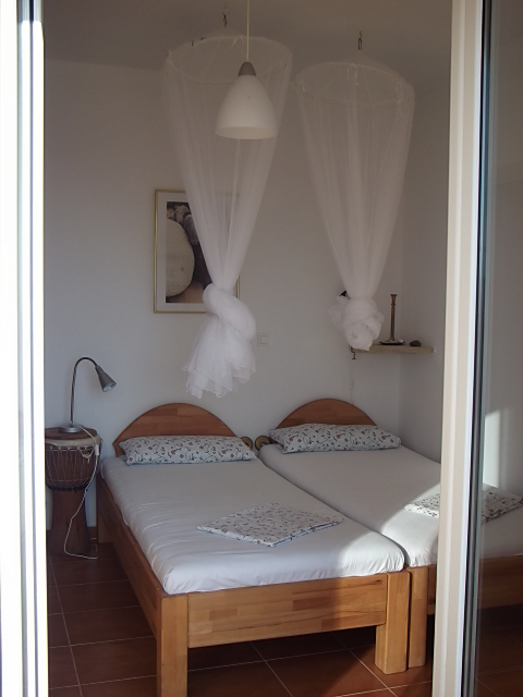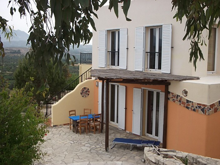Dieses Appartement ist für 2 bis 4 Personen geeignet, da es über zwei gleich grosse Schlafzimmer mit je 2 Betten sowie Kleiderschrank und Kommode verfügt. Ein Schlafzimmer führt mit einer Flügeltür in den Innenhof, das andere zur Terrasse mit Pergola hin, auf der Sie wunderbar Ihr Frühstück einnehmen können. Ein sehr atmosphärischer Wohnbereich mit Küche, Sitzecke und kleinem Schreibtisch wird Ihnen den Aufenthalt sehr angenehm machen. Zusätzlich zum kleinen Innenhof und einer grosszügigen Terrasse mit dem schon beschriebenen Rundblick auf Meer, Psiloritis, Festos und die Messara können Sie auch ein paar Schritte zu einer kleinen, romantischen Felsenterrasse machen, um ein Glas Wein im Abendlicht zu trinken.